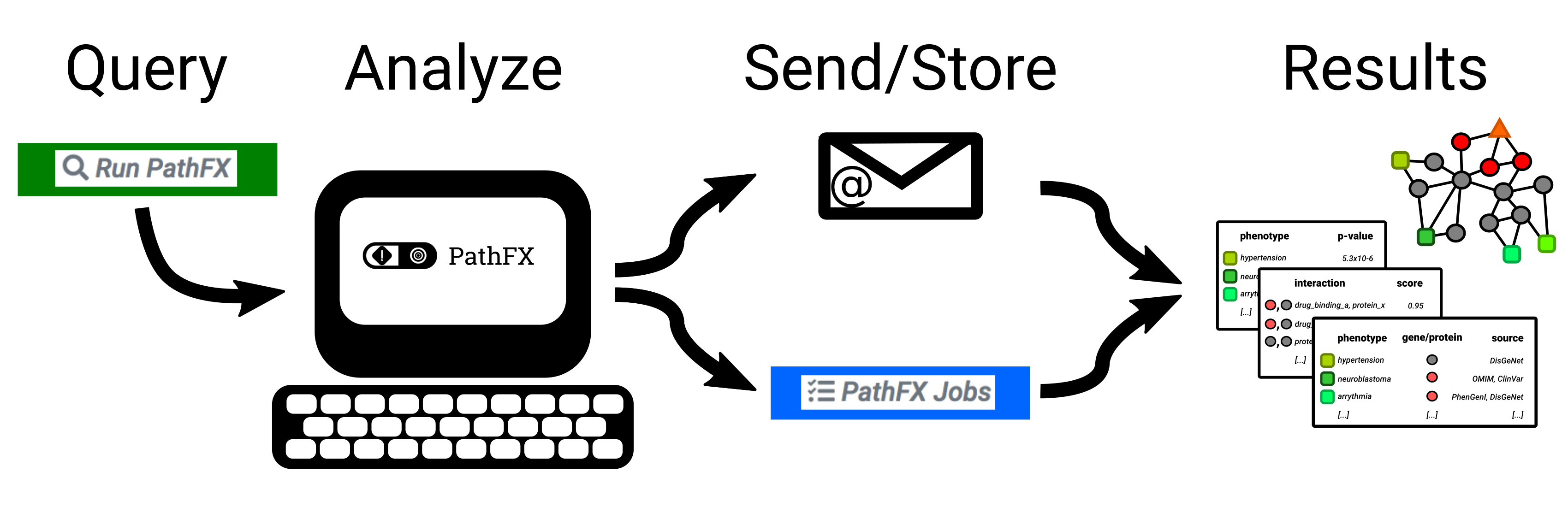 PathFX is designed to look at the pathways-level effects (pathway "FX") of a drug intervention. Under the hood, PathFX is an interaction-network tool that searches for the most relevant protein-protein interactions around a drug's target(s), and then analyzes for which phenotypes the network is enriched relative to the entire interaction network. The algorithm and the web application provide tabular results of associated phenotypes, and a summary figure and table of phenotype clusters based on semantic similarity between phenotypes.